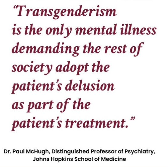 I love Dr. McHugh's statement about coerced compliance with the patients' delusion, but actually all narcissists do this. They try to force people around them to treat the narcissists' false selves as real. Narcissists tend to go into rages and performative self-pity when other people see their underlying weaknesses, inadequacies and psych problems. In my opinion, "trans" identified men act the way they do primarily because so many of them are narcissistic, and not because they are "trans."
